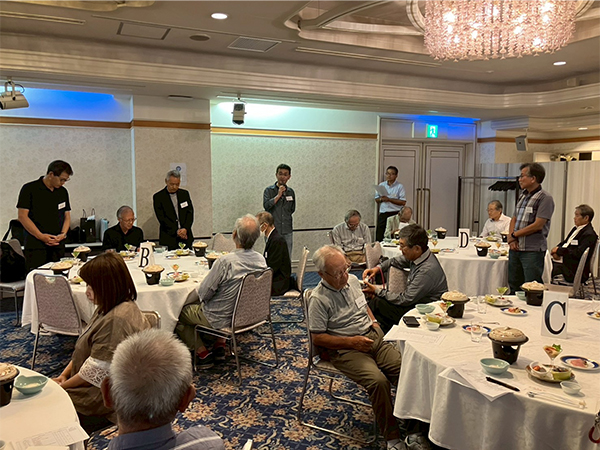食事は、秋の季節の会席料理に舌鼓をうって、また呑み放題のお酒でのどを潤すにつれ、懇親会会場のあちらこちらに歓談の輪が出来ていました。